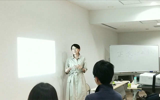 もうひとつの顔であるプロのジャズシンガーの声を生かした「呼吸を感じる誘導瞑想」と「簡単ヨガ」、「日常の中のマインドフルネス談義」を組み合わせた講座を通し、楽しく習慣化するコツを伝えている。